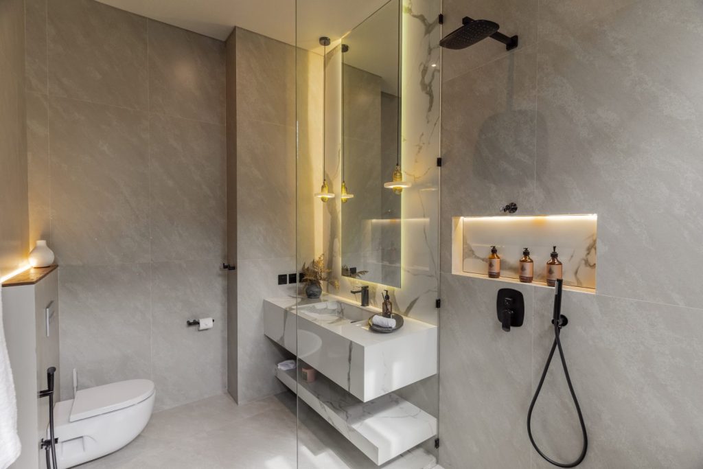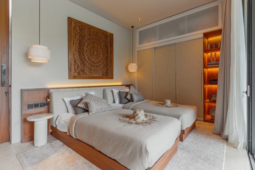 Similarly styled, the second bedroom provides twin beds, built-in closet space, and an ensuite bathroom with luxurious amenities, ideal for relaxation amidst the villa’s tranquil surroundings.