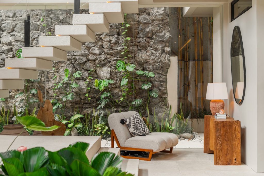 Expansive Living Room: Designed with high ceilings, bohemian-modern décor, and a cozy reading corner under the staircase — a perfect spot to unwind after a day in the sun.