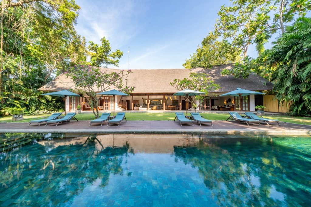 Luxury 7 Bedrooms large Family Villa Bali V75. A vast-style and stunning retreat located in kerobokan set on 2,800 sqm of private land and adorned with elegant Joglo-style-inspired pavilions. This spacious luxury 7 bedrooms family villas offers a large private pool, lush tropical gardens, and a range of facilities.